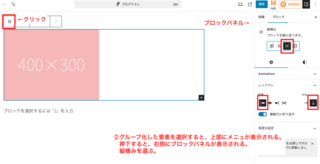 右側(サイドメニュー)のブロックパネルで位置を調整します。
