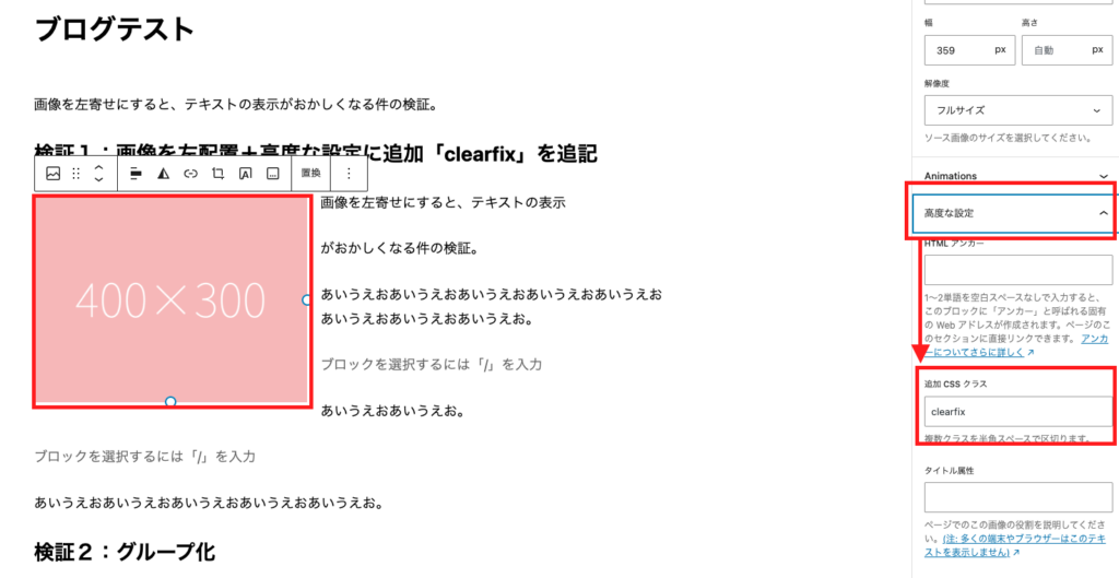 画像を選択し右側のブロックパネルの高度な設定の追加CSSクラスに「clearfix」を設定する。