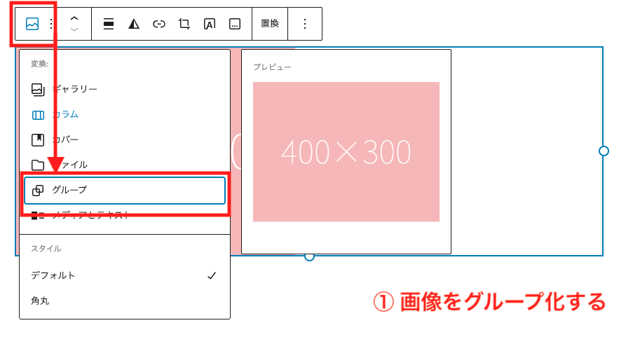 画像を選択し上部に表示されるメニューから、「グループ」を選択しグループ化をします。